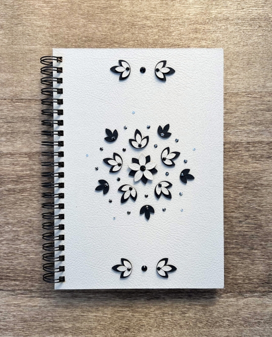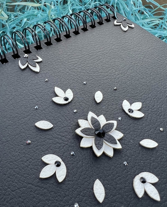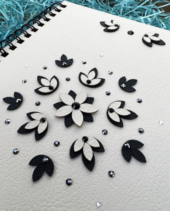Černé květy můžou vzbuzovat tajemnost a eleganci. A přesně takový blok Stella je. V kombinaci s bílou koženkou vznikl jemný kousek, který potěší.